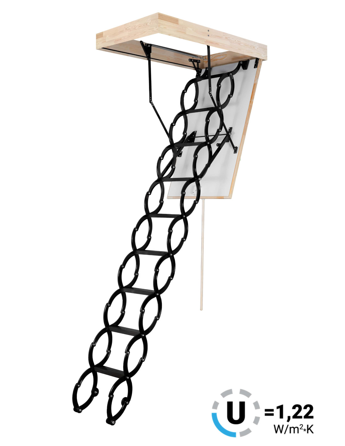 Půdní schody Oman Flex Termo jsou velice oblíbené pro svou jednoduchou ovladatelnost. Nůžkový žebřík roztahujete a stahujete jako harmoniku. Nůžkové schody chody mají zateplené 26mm silné víko, které je z pohledové strany opatřeno bílou HDF deskou. Víko je zatepleno 20mm polystyrénem.