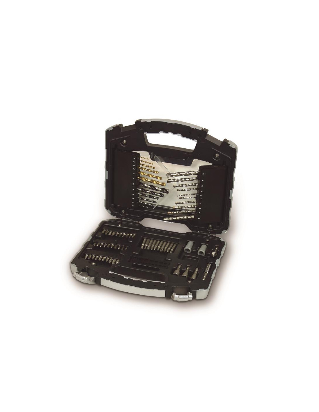 10 vrtáků do betonu O 3, 4, 7, 10 mm (x 1) + O 5, 6, 8 mm (x 2) , 6 titanových vrtáků pro ocel O 2, 3, 4, 5, 6, 8 mm , 6 vrtáků do dřeva O 3, 4, 5, 6, 8, 10 mm , magnetický držák bitů 60 mm , záhlubník O 12,5 mm. 2 nástavce “screw finder” , 3 adaptéry O 6, 7, 8 mm , 30 bitů pro šroubovák (25 mm) , 10 bitů pro šroubovák (50 mm) , měřítko průměrů.